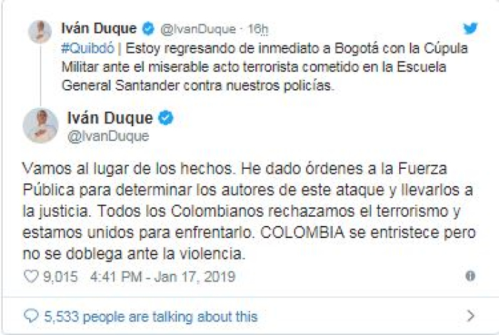 Претседателот на Колумбија Иван Дуке рече дека се враќа во Богота од западот на земјата, каде присуствувал на состанок за бебзедноста, а на безбедносните сили им наложи да ги пронајдат сторителите на нападот и да ги приведат пред лицето на правдата.