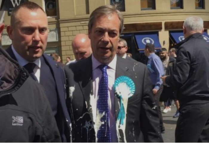 Британскиот политичар Најџел Фараж, познат по евроскептичните ставови, денеска на улица беше погоден со милкшејк додека беше на пат кон Њукасл.