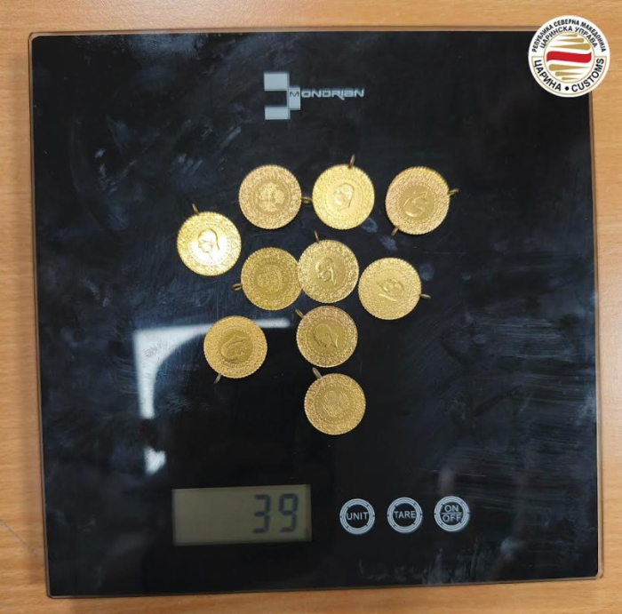 Златни плочки со тежина од 53 грама и 11 златни монети со тежина од 39 грама се пронајдени при контрола на багаж на турски државјанин на излез од државата, на граничен премин Меѓународен Аеродром Скопје. Проценетата вредност на златото изнесува 538 илјади денари.