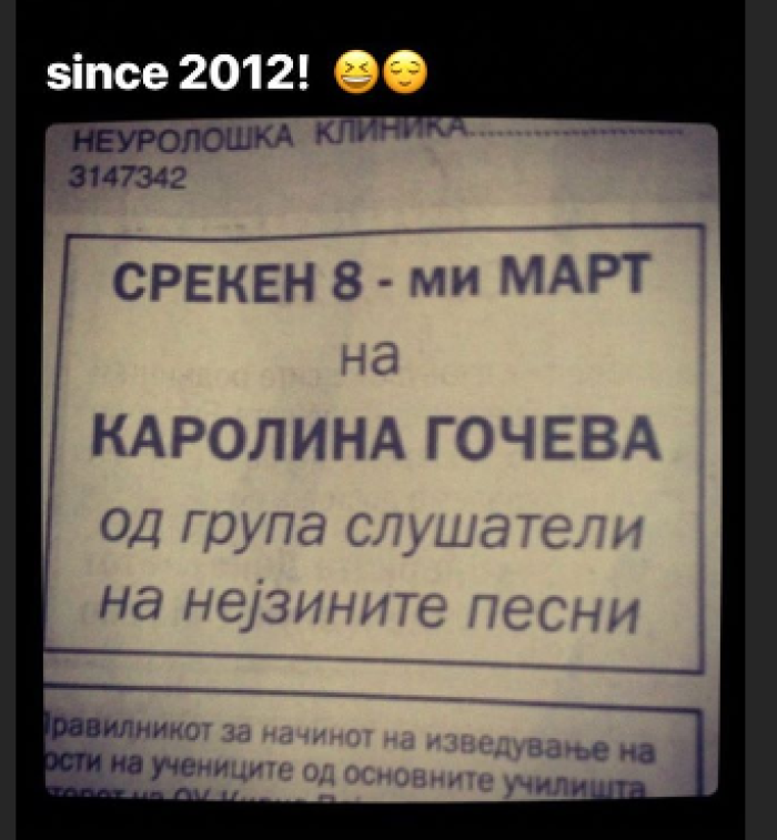 Имено Каролина Гочева, објави фотографија од 2012 година кога група на слушатели, (фанови) на нејзината музика и шесни, во весник и честитаа празник.