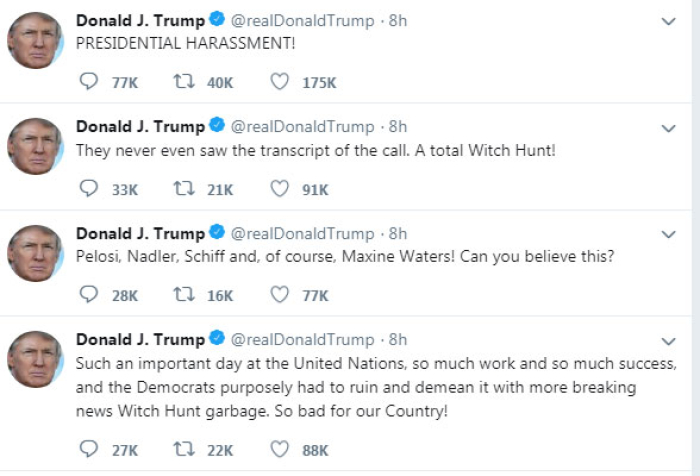 „Таков важен ден во Обединетите нации, толку многу работа и толку многу успех, а демократите намерно мораа да ги уништат и понижат сите со ударни вести. Ловат вештерки “, напиша Трамп на Твитер.