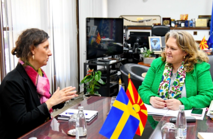 Амбасадорката Ларсон Јаин, како што наведува МО во соопштението, се заблагодари за јасната поддршка од Северна Македонија во периодот на приклучување на Шведска во НАТО.