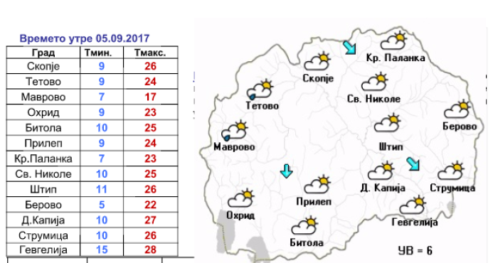 Времето денес (04.09 2017 год.): Сончево со мала до умерена облачност. Ќе дува слаб до умерен северен ветер, особено вдолж Повардарието.