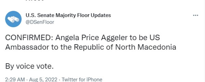 Анџела Прајс Агелер е потврдена за нова амбасадорка на САД во Северна Македонија, објави на Твитер демократското мнозинство во Сенатот.