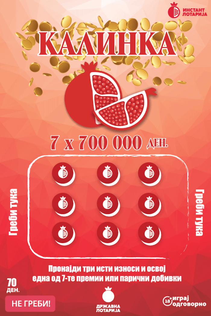 Со својата богата симболика – плодот калинка како симбол на среќа, благодат и радост е дел и од корпоративното лого на Државна лотарија. „Калинка“ е лесна и забавна игра – доволно е да се изгребат полињата за игра и да се пронајдат три исти износи, кои може да ви донесат една од 7-те главни премии по 700.000 денари или една од многубројните други парични добивки.