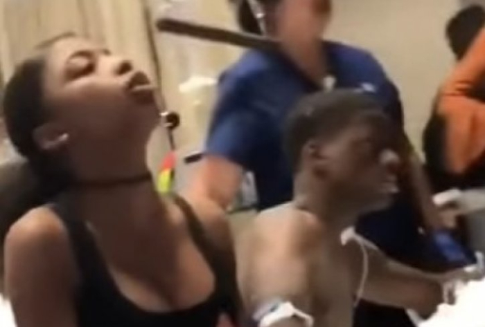 На видеото се гледа како медицинските сестри збунето гледаат, а двете девојки се караат.