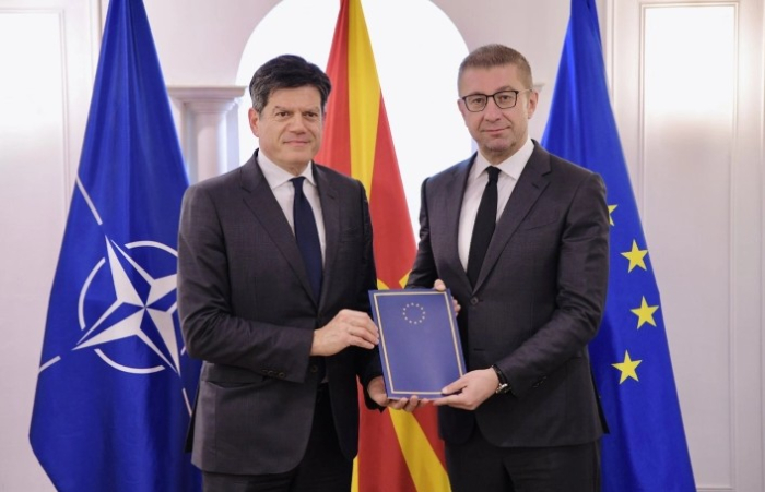Владата останува 100 проценти усогласена со заедничката надворешна и безбедносна политика на Европската унија, што претставува важна придобивка за карактерот на нашите меѓусебни односи и за нивото на нашата посветеност кон европските вредности. Како Влада остануваме целосно посветени на европскиот пат и на реформите кои ја прават државата посилна, пофункционална и поправедна. Ќе ги адресираме сите области каде е забележан застој со конкретни мерки и отчетност. Нашата цел е полноправно членство во рамки на ЕУ, порача премиерот Христијан Мицкоски на заедничката прес-конференција со ЕУ амбасадорот Михалис Рокас по примопредавањето на Извештајот за напредокот на земјава.