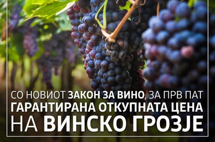 -Законот за вино во целост е на страна на лозарите, решавајќи уште еден голем проблем за лозарите, а тоа е откупната цена. Со новиот закон за вино, за првпат, се утврдува гарантирана производната цена на винско грозје по килограм, најдоцна до 15 јули во тековната година и тоа за најмалку две најзастапени сорти. Пресметката на трошоците за производство на килограм винско грозје на определена површина и соодветен квалитет, согласно дадена методологија, се предвидува да ја врши високо образовна или научна институција од областа во земјоделството. Новиот закон предвидува и креирање на нова годиншна, посебна програма за финасиска поддршка во лозарството и винарството, каде преку конкретни мерки, уште повеќе треба да се развиваат овие два значјни сектори, наведува МЗШВ