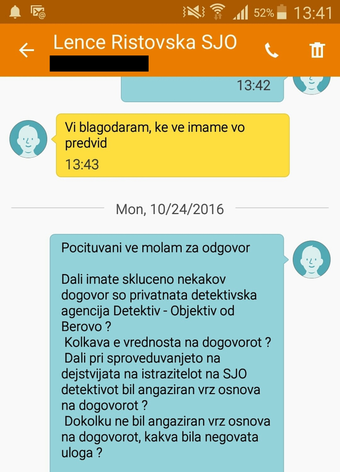 „Во врска со Вашето прашање, Основното јавно обвинителство Скопје Ве известува дека од страна на МВР бевме известени дека од страна на овластени службени лица од МВР, две лица биле затекнати како од возило вршат следење и снимање на лица и објекти.