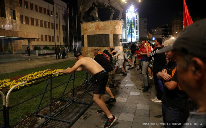 – Осомничените, за време на јавен собир на граѓани, учествувале во толпа и заеднички дејствувале така што започнале да ја влечат заштитната метална ограда поставена од МВР. Oткако ја оттргнале оградата, со тврди предмети – камења, бекатон плочки, железни предмети, сообраќајни знаци, корпи за отпадоци, пиротехнички средства и молотови коктели започнале да фрлаат кон зградата на Собранието. Притоа, на еден полициски службеник му нанеле тешка телесна повреда, а на 27 полицајци распоредени во полициски кордон за заштита на зградата на Собранието и чување на јавниот ред и мир, им нанеле телесни повреди. Со дејствијата осомничените ја оштетиле фасадата на Собранието, искршиле прозорци, го искршиле објектот за обезбедување поставен од МВР, оштетиле полициска опрема и едно полициско возило, се вели во соопштениет од ОЈО Скопје.