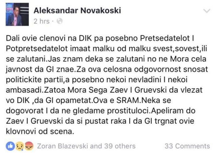 -Дали овие членови на ДИК па посебно претседателот и потпретседателот имаат малку од малку свест, совест или се залутани… Јас знам дека се залутани но не мора цела јавност да ги знае. За ова целосна одговорност сносат политичките партии, а посебно некои невладини и некои амбасади. Затоа мора сега Заев и Груевски да влезат во ДИК, да ги опоменат. Ова е СРАМ. Нека се договараат и да не гледаме проситулоци. Апелирам до Заев и Груевски да си пуштат рака и да ги тргнат овие кловнови од сцена, наведува во својот пост поранешниот претседател на ДИК Александар Новакоски.