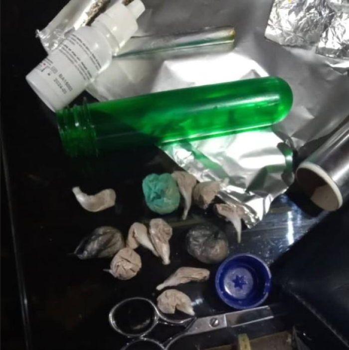 При претрес во неговиот дом, извршен со судска наредба, биле пронајдени и одземени 14 пакувања хероин, повеќе различни видови таблетки, дигитална вага и други предмети со остатоци од непозната материја и пари во различни апоени.