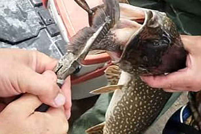 На снимката се гледа како од устата на рибата грабливка излегува друга риба и веројатно оваа втората е таа која го загризала мамецот.