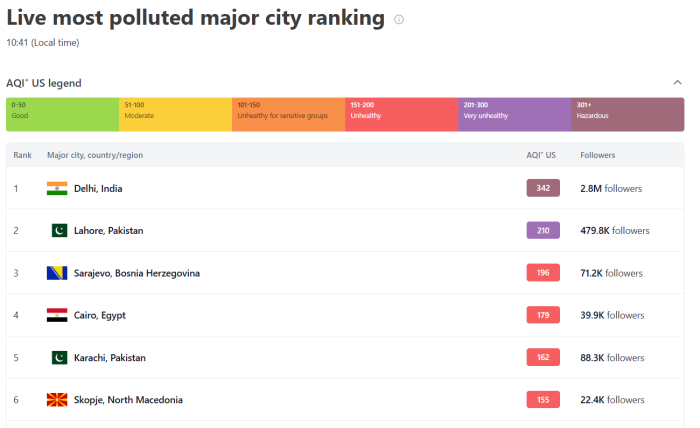 На листата Скопје се најде по Делхи во Индија, Лахоре во Пакистан, Каиро Египет, Сараево во БиХ и Карачи во Пакистан.