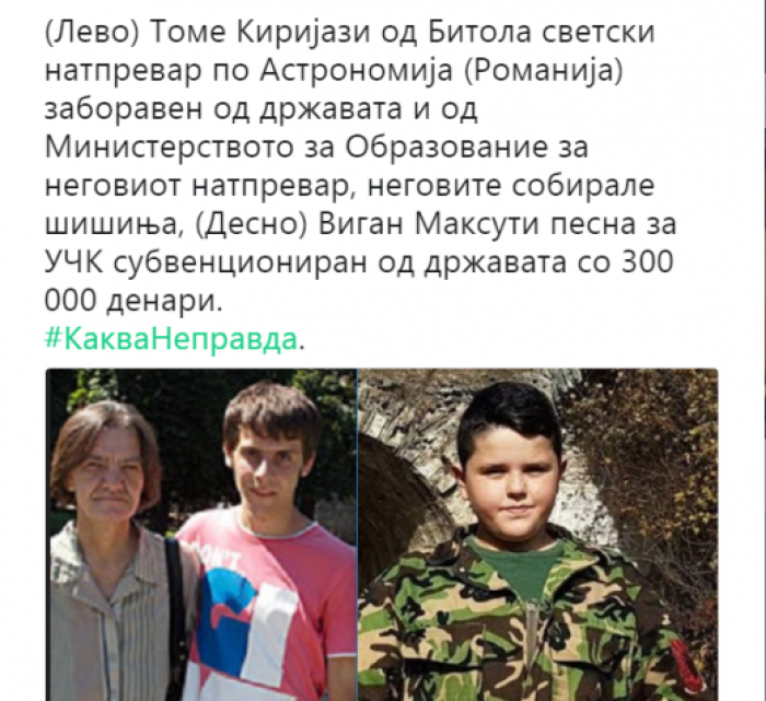 И додека државата не се грижи за децата како Томе, на Виган Максути за песната за УЧК му додели 300.000 денари субвенција.