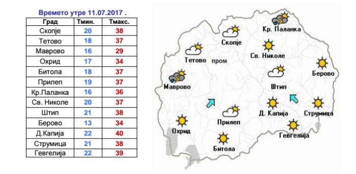 Времето денес (10.07 2017 год.): Сончево и многу топло со мала локална облачност и со слаб до умерен јужен ветер. Попладне во планинските подрачја ќе има услови за локална појава на краткотраен дожд и ретки грмежи. УВ=9 Максималната температура ќе биде во интервал од 31 до 40 степени.
