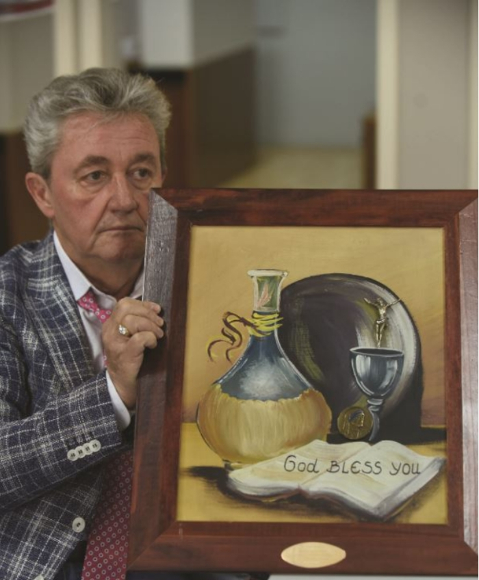 Уметничкото дело кое Алојз Гомбар го подготви за папата Франциск денеска го донесе во редакцијата на весникот ВЕЧЕР.-Откако се обзнани дека на папата ќе му дадам подарок, ми се јавија новинари од Франс прес, од државната телевизија на Полска, како и од неколку телевизии од Хрватска и од Словенија. Дури и од САД ме побараа да зборувам во директен пренос за тамошна телевизија. Но, јас решив мојата приказна прво да ја кажам во весникот кој секојдневно го купувам и го читам со години, рече наследникот на Мајка Тереза.