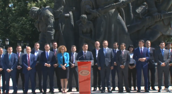 Премиерот Зоран Заев во моментов оддржува прес конференција пред споменикот на Ослободителите на град Скопје, во дворот на Владата.