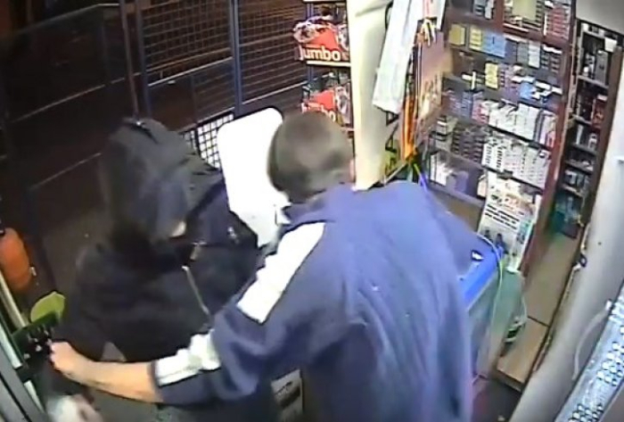 Може да се види судирот на разбојникот со газдата на локалот. На почетокот, разбојникот во црна јакна неколку минути шетал пред трафиката, додека не пронашал дупка во оградата над вратата и влегол внатре. Тогаш почна борбата.