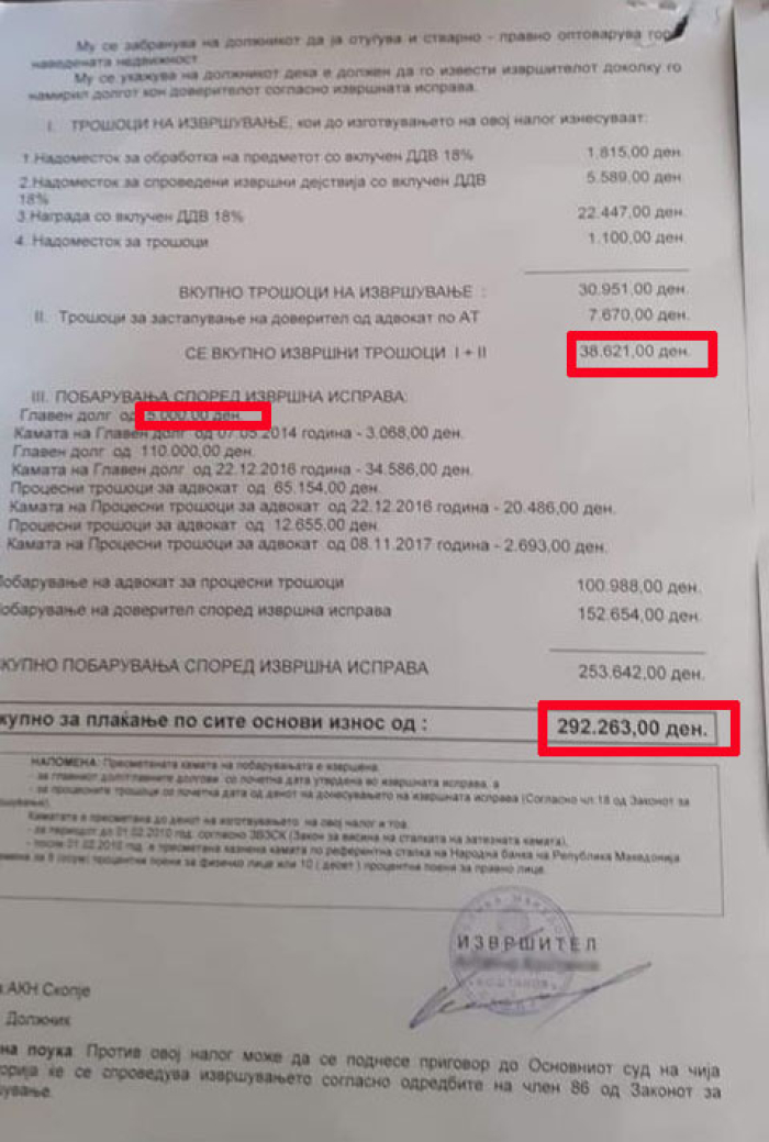 Главниот долг, првично е 5.000 денари. Сегашниот, каде се пресметани камати на главен долг, главен долг, камати, трошоци за адвокат… изнесува 292.263 денари. Дополнително, само трошоците за извршување чинат 38.621 денар.