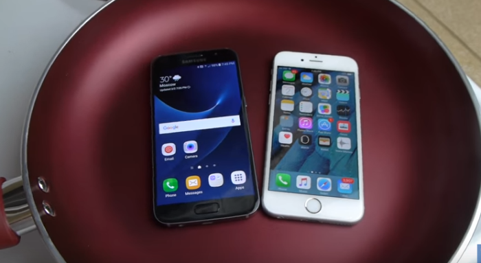 Популарниот јутубер во тавче загреа вода до степен на вриење, а тогаш во нејзе ги стави двата модели на телефони.
